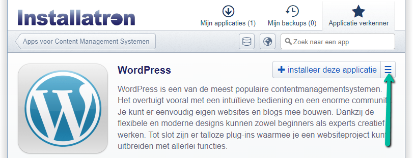 In plaats van opdracht te geven om te installeren, selecteer je het hamburgermenu. In het menu dat uitklapt, kies je ervoor om een WordPress website te importeren.