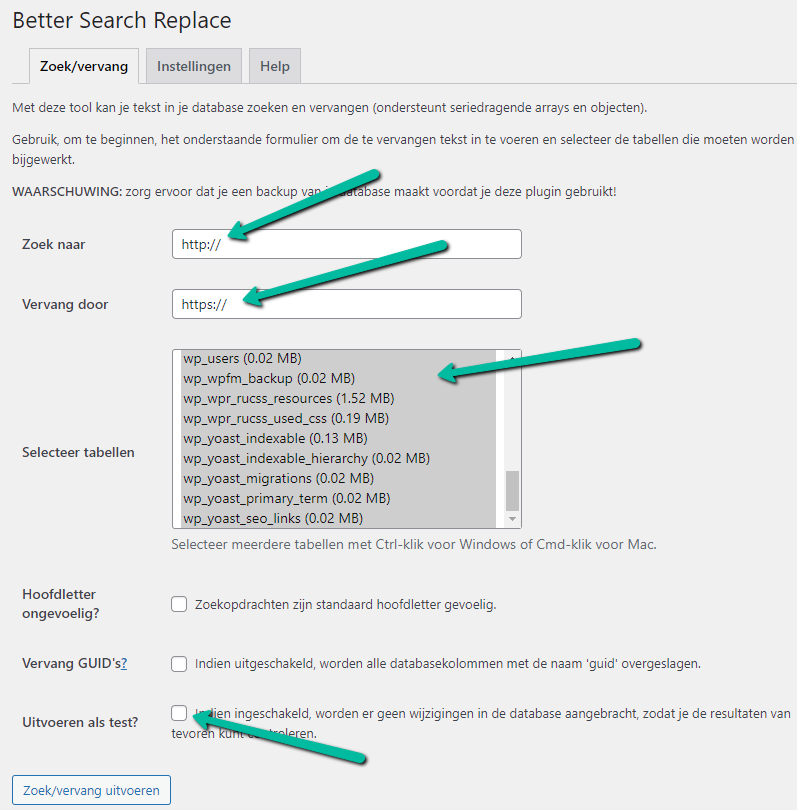 Download de plugin Better Search Replace. Zet daarin een vervangopdracht voor alle ‘https://’ naar ‘https://’ in de database. Selecteer alle tabellen. Vergeet niet om het vinkje bij ‘Uitvoeren als test’ weg te halen. Anders worden de veranderingen niet uitgevoerd op de database. Na gebruik verwijder je deze plugin weer.